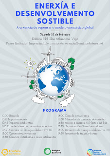 Amigos da Terra e Enxeñería Sen Fronteiras apoiadas pola Plataforma por un Nuevo Modelo Energético unen esforzos para organizar a xornada “Enerxía e Desenvolvemento sostible. A urxencia de repensar o modelo enerxético global” que se celebrará o vindeiro sábado 18 de febreiro en Vigo.