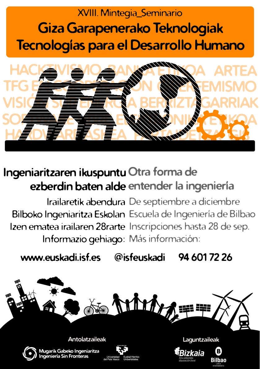 Ingeniería Sin Fronteras País Vasco – Euskal Herriko Mugarik Gabeko Ingeniaritza (ISF-MGI) junto con la UPV/EHU organiza el Seminario sobre Desarrollo, Cooperación y Tecnologías para el Desarrollo Humano en la Escuela de Ingeniería de Bilbao en el marco del proyecto de Sensibilización y Educación para el Desarrollo en las Enseñanzas Técnicas de Bizkaia y con el apoyo del Ayuntamiento de Bilbao.