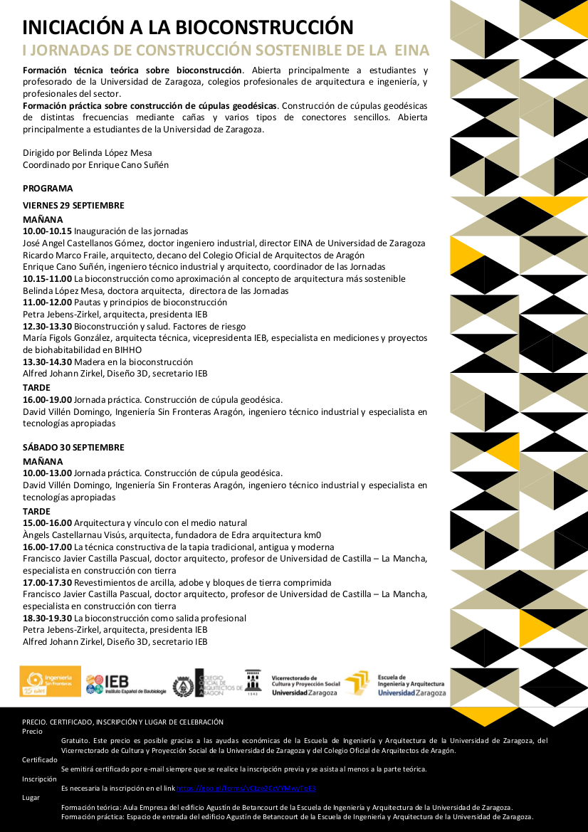 Nos ha costado, pero aquí están, las primeras jornadas de bioconstrucción en la Universidad de Zaragoza junto con el Instituto Español de Baubiologie y la Escuela de Ingeniería y Arquitectura de la Universidad de Zaragoza. Se celebrarán en la EINA los días 29 y 30 de septiembre.
