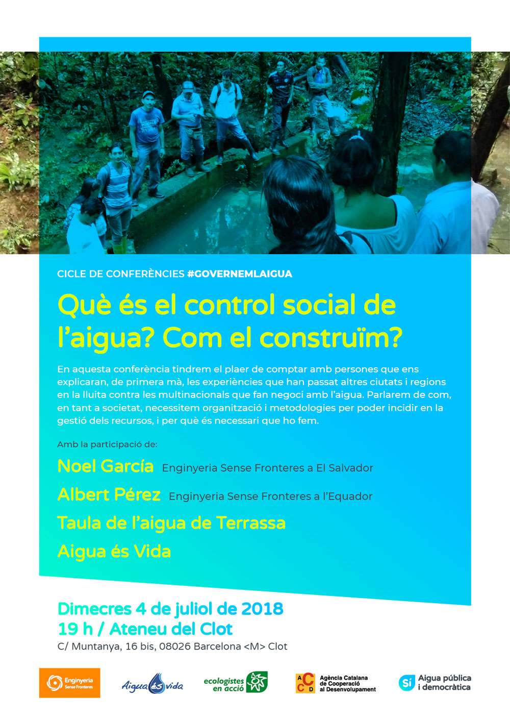 Formaran part de la conferència el Noel García (Enginyeria Sense Fronteres – El Salvador) i Albert Pérez (Enginyeria Sense Fronteres – Equador), que ens parlaran i faran un repàs històric des de la necessitat de participació fins a la defensa d’aquesta als respectius països d’Amèrica Llatina. Seguidament aterrarem aquestes experiències a Catalunya amb la Taula de l’Aigua de Terrassa i Aigua és Vida, que repassaran l’actualitat a casa nostra i analitzaran les nostres necessitats.