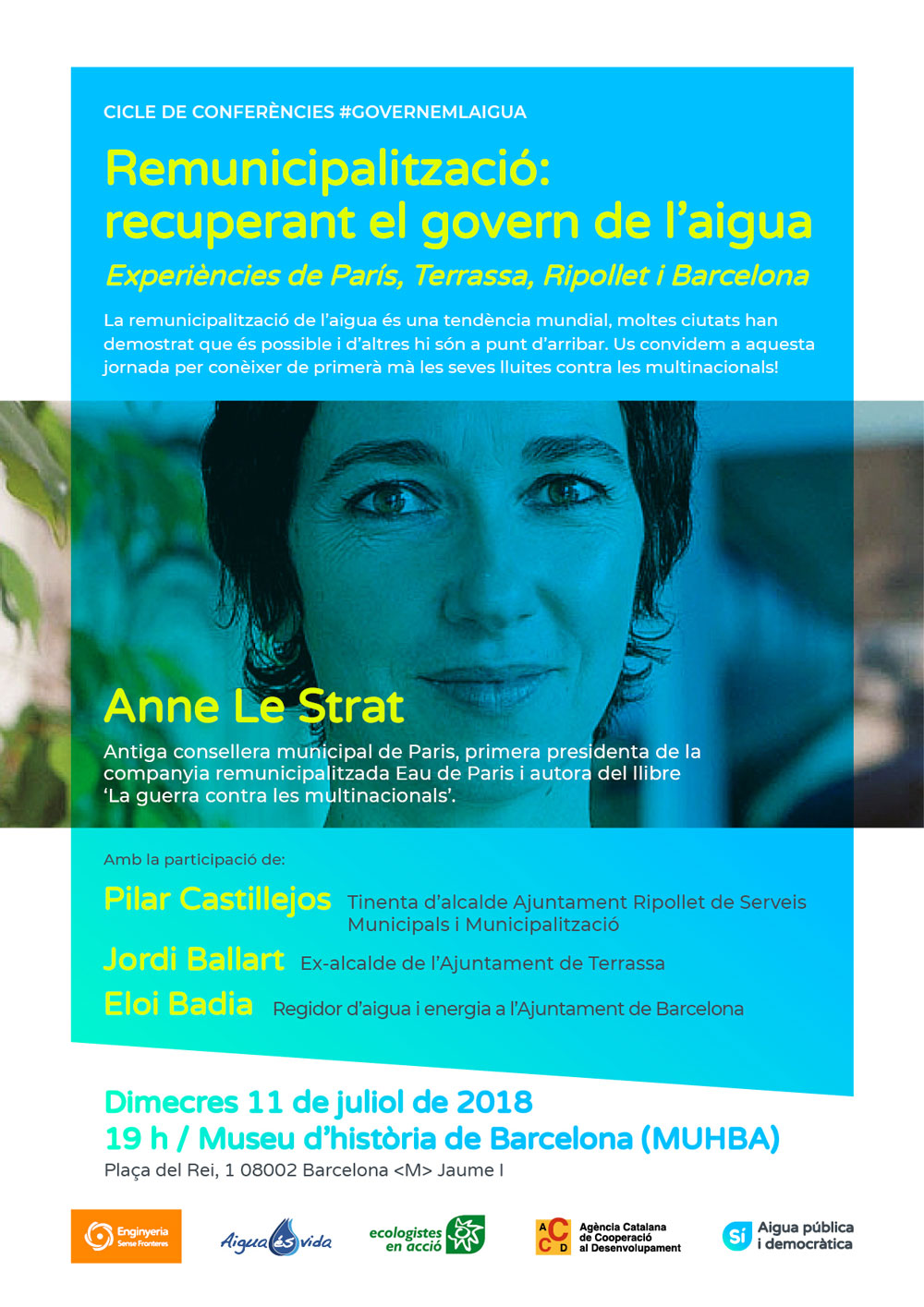 Per la segona xerrada d’aquest cicle #GOVERNEMLAIGUA del juliol, tindrem el plaer de comptar amb la presència i l’experiència d’Anne Le Strat, antiga consellera municipal de París, primera presidenta de la companyia remunicipalitzada Eau de Paris i autora del llibre “La guerra contra les multinacionals“