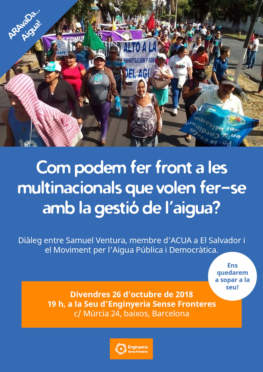 Us convidem a venir a sentir de primera mà diferents estratègies de mobilització i incidència política a El Salvador i a Barcelona amb la finalitat de fer front a les multinacionals que volen fer-se amb la gestió de l’aigua. Parlarem amb Samuel Ventura, membre d’ACUA a El Salvador i el Moviment per l’Aigua Pública i Democràtica.