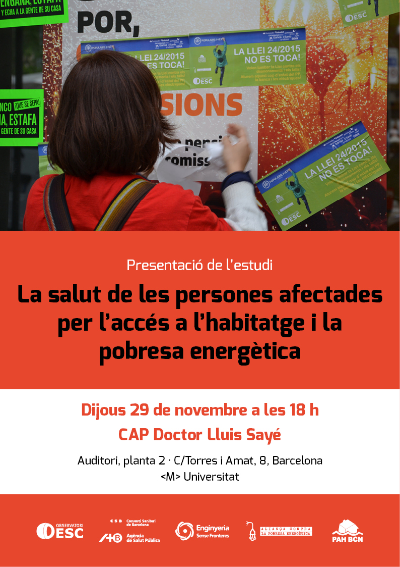 El pròxim 29 de novembre, a les 18.30 h, presentarem al CAP Doctor Lluis Sayé, Auditori, planta 2 (c/Torres i Amat, 8, Barcelona <M> Universitat), el tercer informe que hem realitzat conjuntament la PAH de Barcelona, l’Aliança contra la Pobresa Energètica (APE), Enginyeria Sense Fronteres (ESF), l’Observatori dels Drets Econòmics Socials i Culturals (Observatori DESC) i l’Agència de Salut Pública de Barcelona (ASPB).