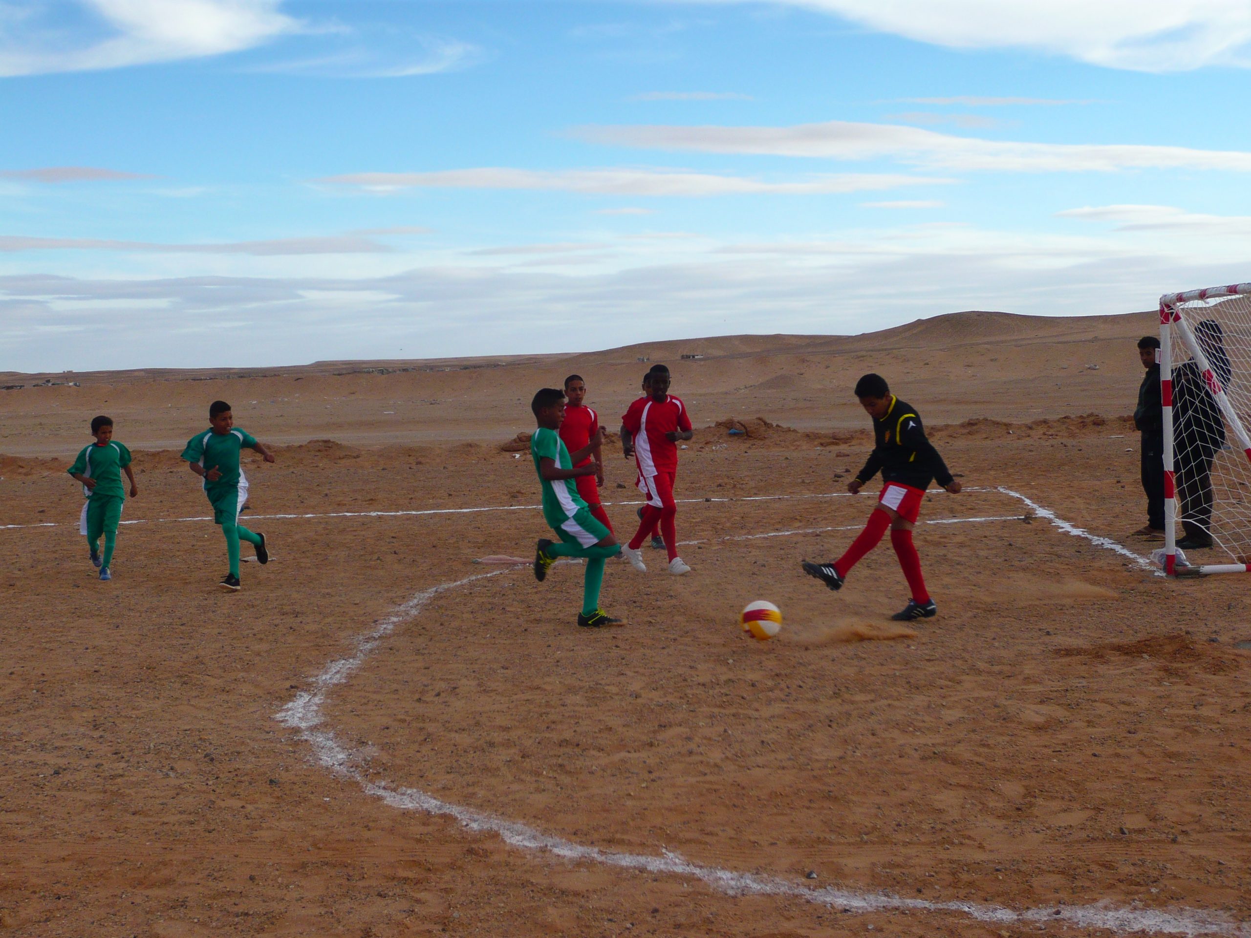 El pasado sábado, aprovechando que la escuela estaba cerrada por fin de semana (recordemos que aquí es viernes-sábado, ya que en los países musulmanes el día de fiesta religiosa es el viernes como en los cristianos es el domingo), se estuvo toda la mañana trabajando en un espacio anexo al centro pero fuera de este, donde se construyó una pista de fútbol sala. Como material se compraron previamente perfiles metálicos y se soldaron para realizar la portería; posteriormente estas se pintaron de blanco y rojo. Además, se pintaron las líneas que delimitan el campo, las áreas y el centro del campo con mezcla de cal y agua. También se completó y mejoró una pista de voleibol al lado de la de fútbol, la cual ya contaba con los postes y la red pero carecía de un espacio delimitado para la práctica del deporte. De este modo, con la misma mezcla se pintaron las líneas de la pista.