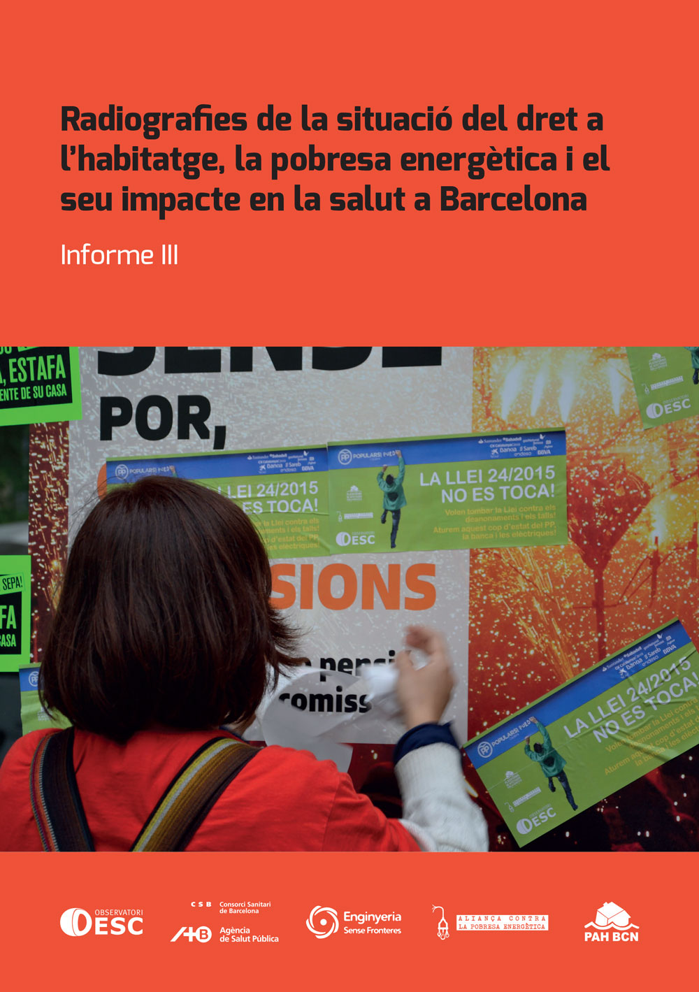 Avui 29 de novembre, presentem el tercer i últim informe emmarcat dintre de la sèrie de “Radiografies de la situació del dret a l’habitatge, la pobresa energètica i el seu impacte en la salut a Barcelona” elaborats conjuntament entre l’Aliança contra la Pobresa Energètica (APE), Enginyeria Sense Fronteres (ESF), l’Observatori dels Drets Econòmics Socials i Culturals (Observatori DESC) i la Plataforma d’Afectats per la Hipoteca (PAH) amb la col·laboració de l’Agència de Salut Pública de Barcelona (ASPB). Aquest és el tercer informe que pretén aprofundir en la salut de les persones afectades per problemes relacionats amb l’accés econòmic a un habitatge o als subministres bàsics.