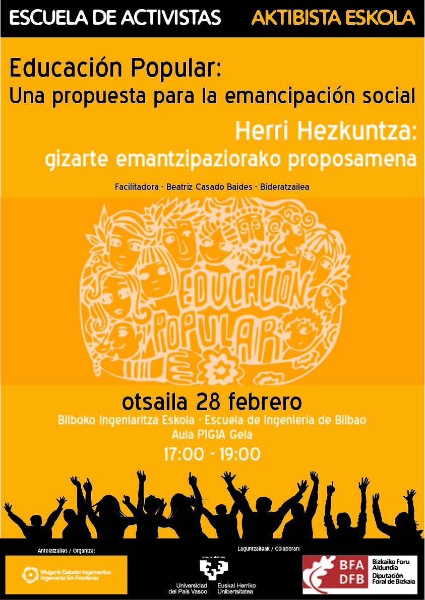 Gai hauetan sakontzeko, hurrengo Aktibista Eskolako saioan Beatriz Casado ikerlari militantea, antropologian aditua eta erizaina izango dugu bideratze lanetan. Erakunde eta gizarte-eragile ezberdinekin lan egin eta kolaboratu du herri hezkuntzako, ikerketa-ekintza parte-hartzaileko, komunitateetako dinamizazioko eta formakuntza politikoko prozesuetan. Bere laguntzaz, Herri Hezkuntzaren oinarriak ezagutzeko aukera izango dugu. Saiora bertaratzeko eginbehar bakarra hezkuntza(arroba)euskadi.isf.es helbide elektronikora aurretiaz mezua bidaltzea da, AKTIBISTA ESKOLA hitza honen gaian adieraziz, sarrera doakoa eta librea da eta. Gainera, saio honetan parte hartzeko ez da beharrezkoa Aktibista Eskolako aurreko saioetara etorri izana.