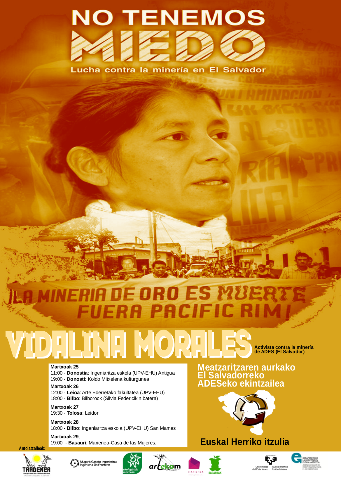 La visita de Vidalina Morales a tierras vascas pretende dar a conocer la labor de las mujeres salvadoreñas en la defensa del territorio y de los Derechos Humanos como fuente de inspiración para otros territorios en resistencia. Compartir las realidades y las luchas de otros pueblos como herramienta para fomentar la solidaridad y la resistencia.