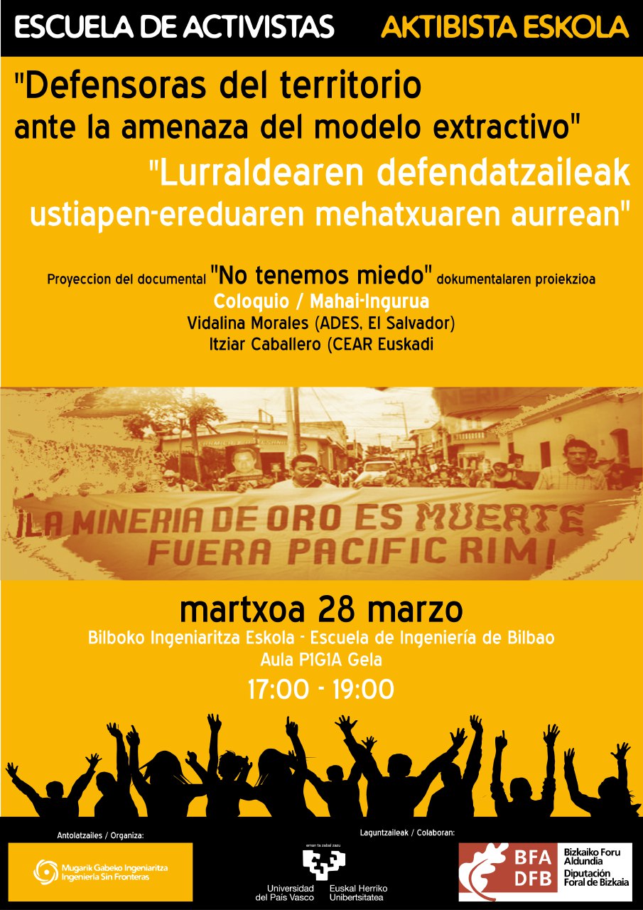 Ekozimaldia 2019aren barne, “No tenemos miedo” dokumentalaren emanaldia izango dugu. Dokumental horrek El Salvadorko meatzaritza metalikoa debekatzea lortu zuen borroka-prozesua laburbiltzen du. Vidalina Morales, komunitate burua, ingurumen defendatzailea eta El Salvadorreko meatzaritza metalikoaren aurkako borrokako kidea da, eta lehen eskuko testigantza eskainiko digu. Horrez gain, gurekin izango dugu Itziar Caballero (CEAR Euskadi) gaur egun Giza Eskubideen defendatzaileen defentsa nola lantzen den eta eskura ditugun mekanismo eta tresnen inguruan hausnartzeko. Zure zain egongo gara!