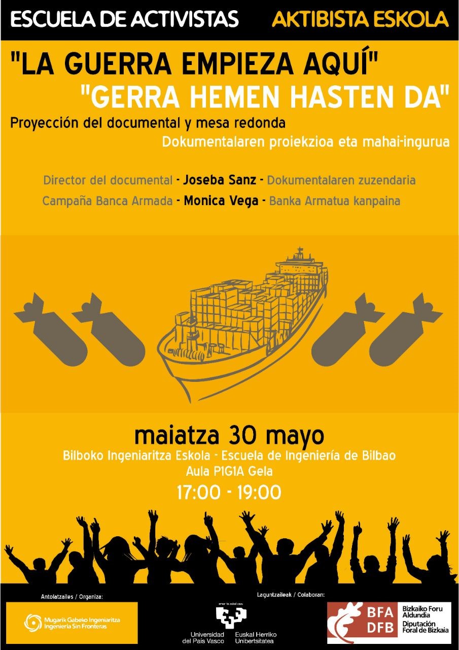 “La guerra empieza aquí” dokumentalaren proiekzioarekin hasiko dugu saiao. Dokumentalak irabazi handiak ematen dituen sektore horren mekanismoak ikusaraztea eta armen trafikoari amaiera emango dion erantzuna sortzea ditu helburu. Zein erakunde publikok eta pribatuk eusten dute ekonomikoki armen sektorea? Zer dago gobernu autonomoaren eta unibertsitate publikoaren gardentasun ezaren atzean? Proiekzioaren ostean, mahai-ingurua izango dugu Joseba Sanz, dokumentalaren zuzendariarekin, eta Mònica Vega, Banka Armatua Kanpainako kidearekin batera. Zure zain egongo gara!