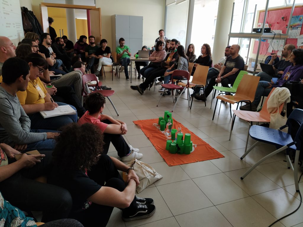Por la noche, de vuelta a la vertebración. Esta vez nos tocó visitar el CSO La Molinera, un espacio singularísimo y muy simbólico (como veremos más abajo) habilitado en un antiguo hotel de cinco estrellas. Nos acogieron con mucho cariño, y tuvimos oportunidad de demostrar nuestras dotes teatrales con los retos que nos plantearon las personas integrantes del grupo organizador.