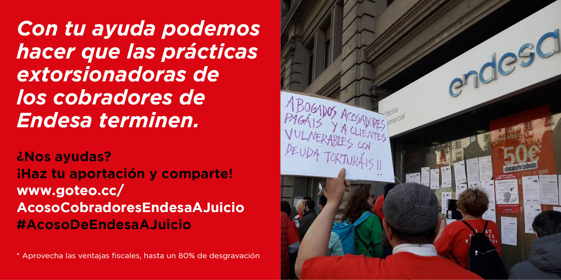 Con la campaña invitamos a la ciudadanía comprometida a hacer su aportación y ser partícipe de esta batalla contra el Oligopolio evitando que ninguna empresa de recobro contratada por Endesa o cualquier otra suministradora vuelva a acosar a familias vulnerables. Es el momento de que las compañías, que consienten la práctica de estas actuaciones, dejen de derivar la deuda de familias en situación de vulnerabilidad a terceros actores.