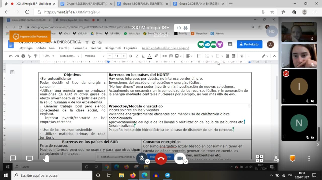 La sesión se centró principalmente en discutir una serie de conceptos relacionados con la soberanía energética. ¿Cuáles son sus objetivos? ¿Qué barreras encontraría en los países del norte? ¿Y en los del sur? ¿Cuál es el modelo energético que debería seguir y cómo debería ser su consumo energético asociado? Tras un intenso debate grupal pusimos en común nuestras opiniones y llegamos a una conclusión bastante consensuada.