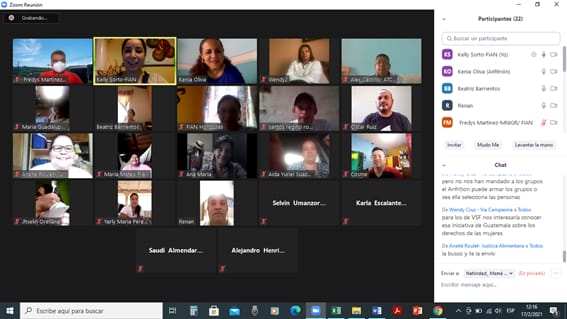 La primera sessió ha sigut tot un èxit amb més de 30 participants que formen part de organitzacions de la regió centreamericana com: Organización de Mujeres Mamá Maquin (Guatemala), Asociación Comunitaria Unida por el Agua y la Agricultura (ACUA) El Salvador, Articulación de Mujeres de la Vía Campesina Honduras (AMVCH/CODIMCA), Asociación de Trabajadores del Campo (ATC) Nicaragua, i la Asociación FIAN Hondures totes vinculades a la defensa del Drets Humans.