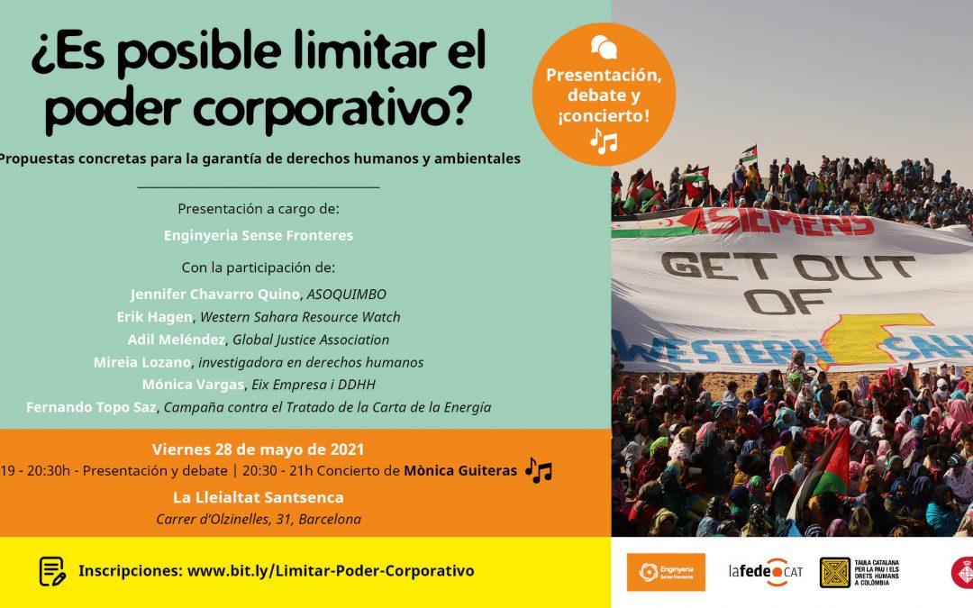 ¿Es posible limitar el poder corporativo? Propuestas concretas para la garantía de derechos humanos y ambientales Viernes 28 de mayo, 19h //  Lleialtat Santsenca (C/Olzinelles, 31)  Presentación y debate: -Jennifer Chavarro Quino, ASOQUIMBO -Erik Hagen, Western Sahara...