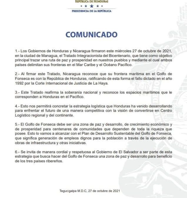 Acuerdo Honduras-Nicaragua para reconocer la salida al Pacífico de Honduras