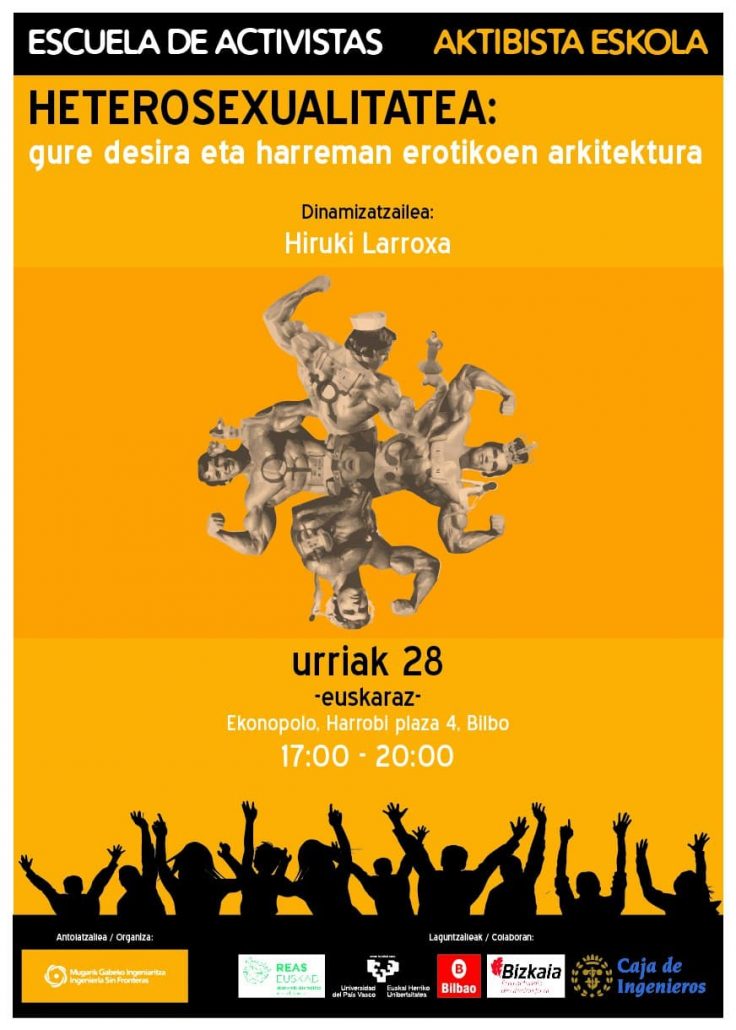 Hiruki Larroxak (hirukilarroxa.eus) heteroarauaren atzean lan egiten duen arkitekturaren analisia egingo du, eta sexu-askapenerako beste eredu batzuk jorratuko ditu metodologia parte-hartzaileen bitartez. Saio hau aurrez aurrekoa izango da, eta beharrezko segurtasun-baldintzak ziurtatzeko, hezkuntza (arroba) euskadi.isf.es helbide elektronikoan izena ematea beharrezkoa da.