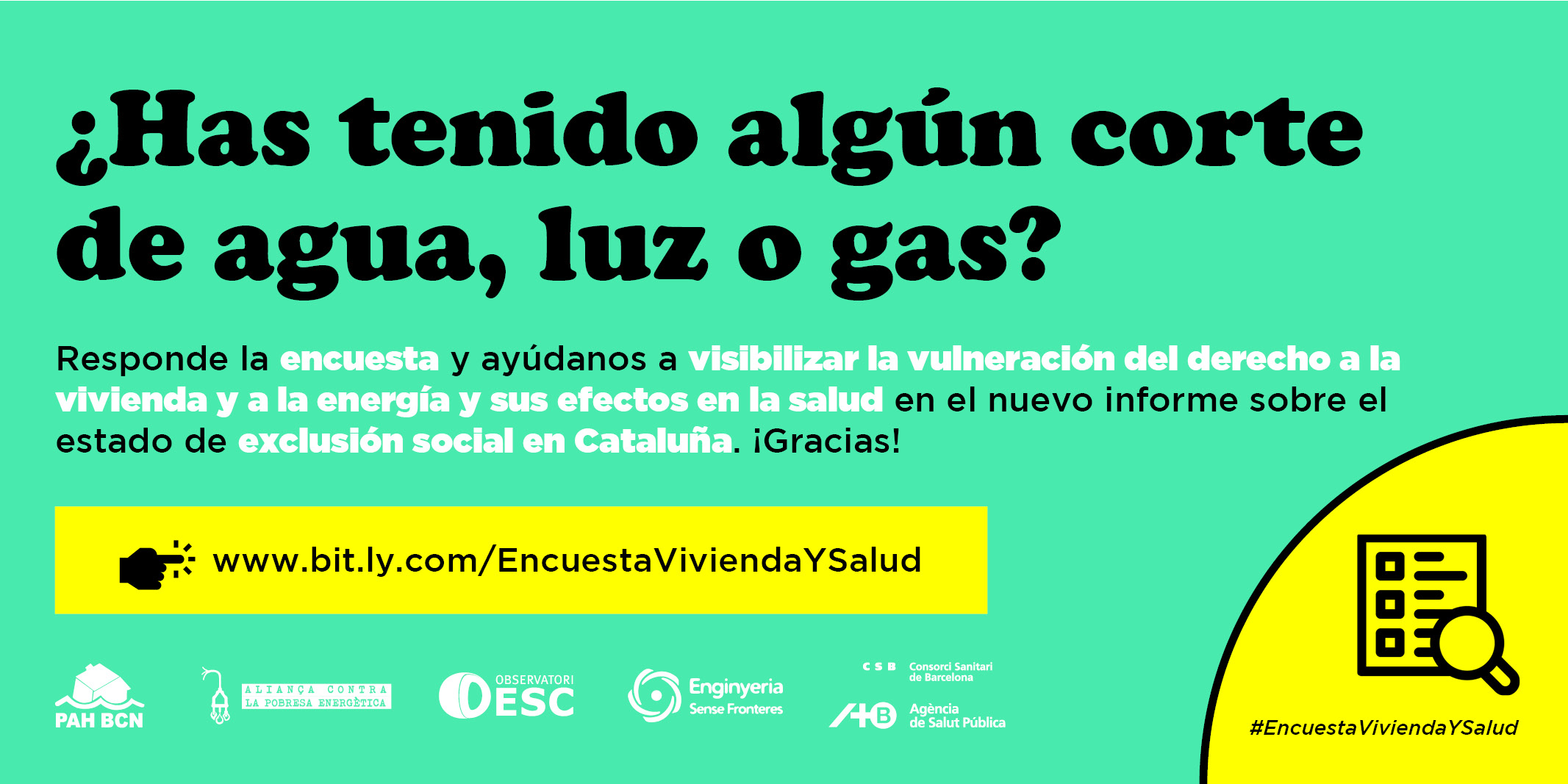 La PAH de Barcelona, la Alianza contra la Pobreza Energética, el Observatori DESC, Enginyeria Sense Fronteres y la Agencia de Salud pública de Barcelona estamos elaborando un nuevo informe sobre el estado de exclusión social en Cataluña y el impacto que tiene sobre las personas vulnerables la Ley 24/2015 contra los desahucios y los cortes. Si es conocida o no, y lo más importante: qué efectos tiene en las familias que están en riesgo de perder su vivienda.